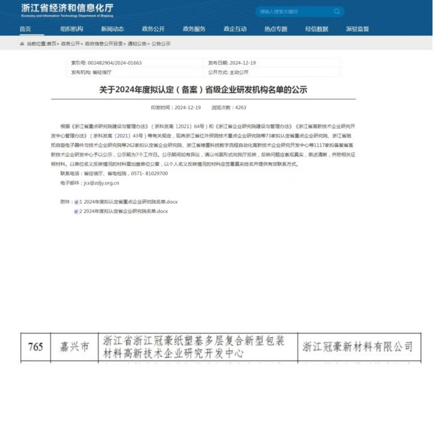 近日,浙江省經(jīng)濟和信息化廳公示了 2024 年度省級企業(yè)研發(fā)機構認定結果,浙江冠豪順利通過浙江省高新技術企業(yè)研究開發(fā)中心認定,被正式授予“浙江省浙江冠豪紙塑基多層復合新型包裝材料高新技術企業(yè)研究開發(fā)中心”稱號,這一重要成果標志著浙江冠豪在科技創(chuàng)新和研發(fā)能力方面邁出了堅實的一步。