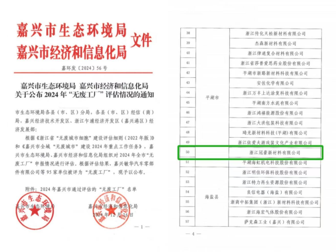 近日,嘉興市生態(tài)環(huán)境局和經(jīng)信局正式公示了2024年“無廢工廠”名單,浙江冠豪順利通過評(píng)審,成功獲評(píng)“無廢工廠”稱號(hào)。